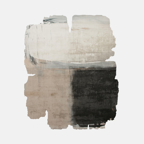 Across the series, compositions appear built through layered marks, washes of pigment-like color, and fragmented planes that intersect or dissolve into one another. The surfaces evoke the visual language of studio practice — brushstrokes, scraped textures, and areas where forms seem partially revealed or obscured. These elements create a sense of movement and depth that unfolds gradually across the textile field.