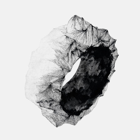 The design centers around a ring-like formation, where angular structures radiate outward from a central void. These sharp, faceted forms echo the geometry of metal studs, transforming a cultural symbol of rebellion into a tactile field of texture and relief. Lines converge and disperse across the surface, creating a dynamic tension between density and openness.
