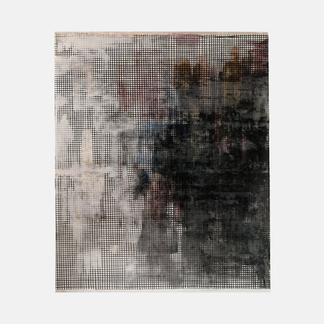 A defining element of the collection is the visible grid that underlies several compositions. This structural layer recalls the framework of drawing paper, architectural drafting, or the warp and weft of the loom itself. Within this ordered matrix, painterly forms appear to dissolve, expand, or gather into darker concentrations, creating a tension between precision and spontaneity.